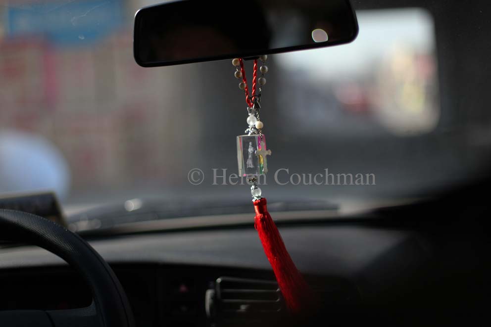 A cross hangs from the volenteers car mirror. AIDS in China